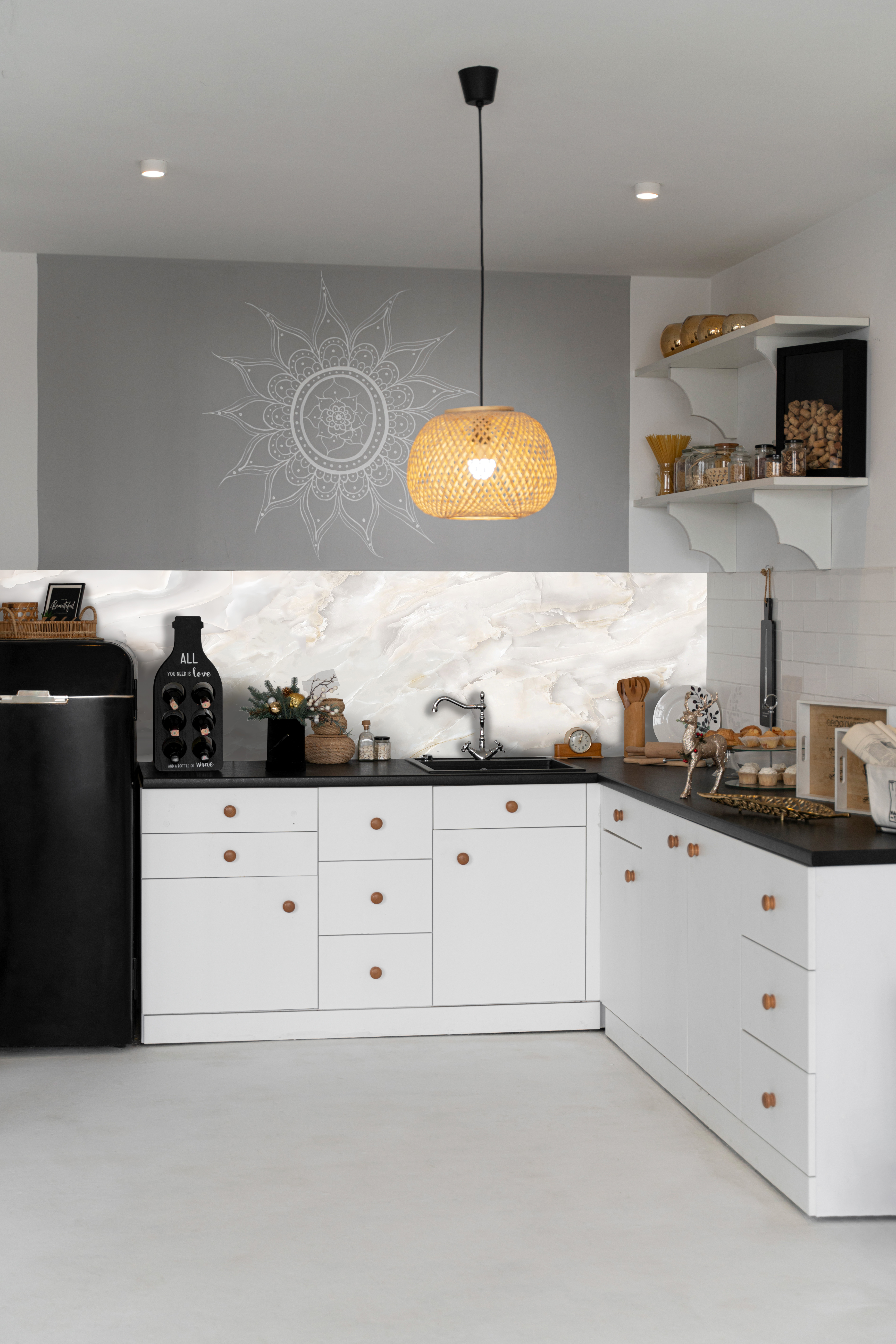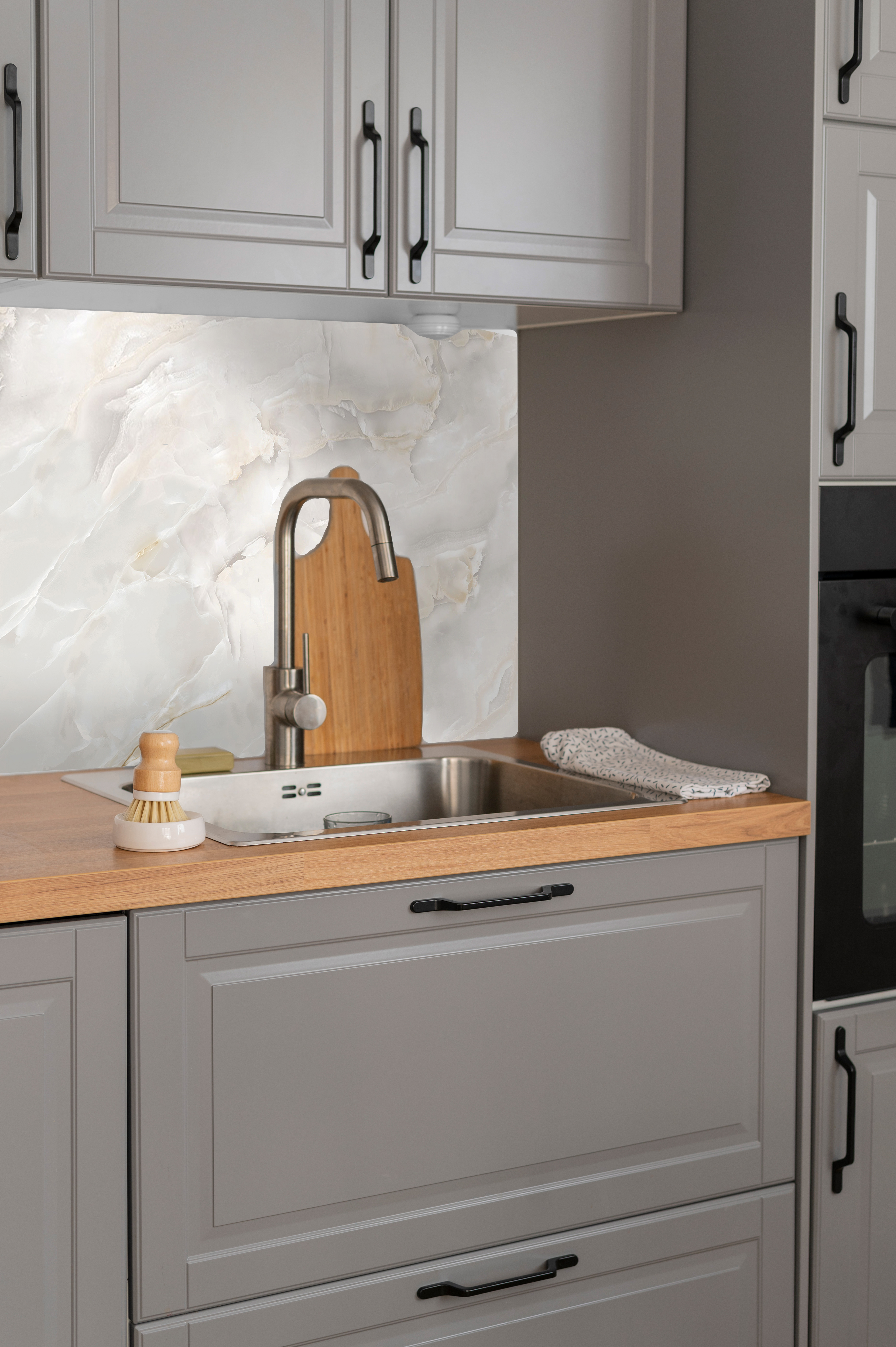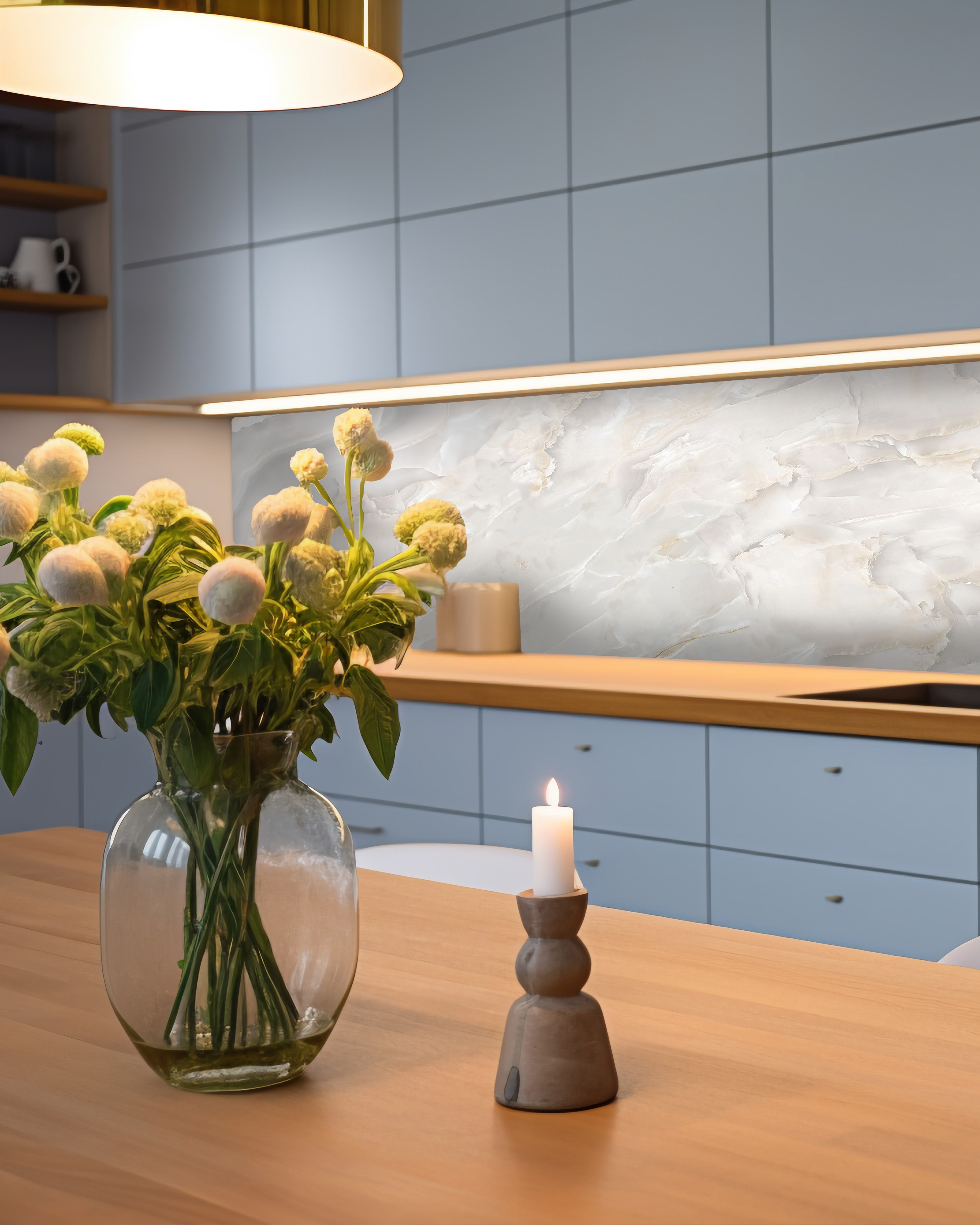 Кухонный фартук — элемент декора кухни, предназначенный для защиты стен от загрязнений. Преимущества: не боится влаги; высокая износостойкость; лёгкий; удобный при монтаже; устойчив к выцветанию и износу; удобен при транспортировке, складировании и хранении; Уход: Любое моющее неабразивное средство, например, то, которое используется для мойки посуды, или мыло. В большинстве случаев достаточно протирать поверхность влажной тканью.