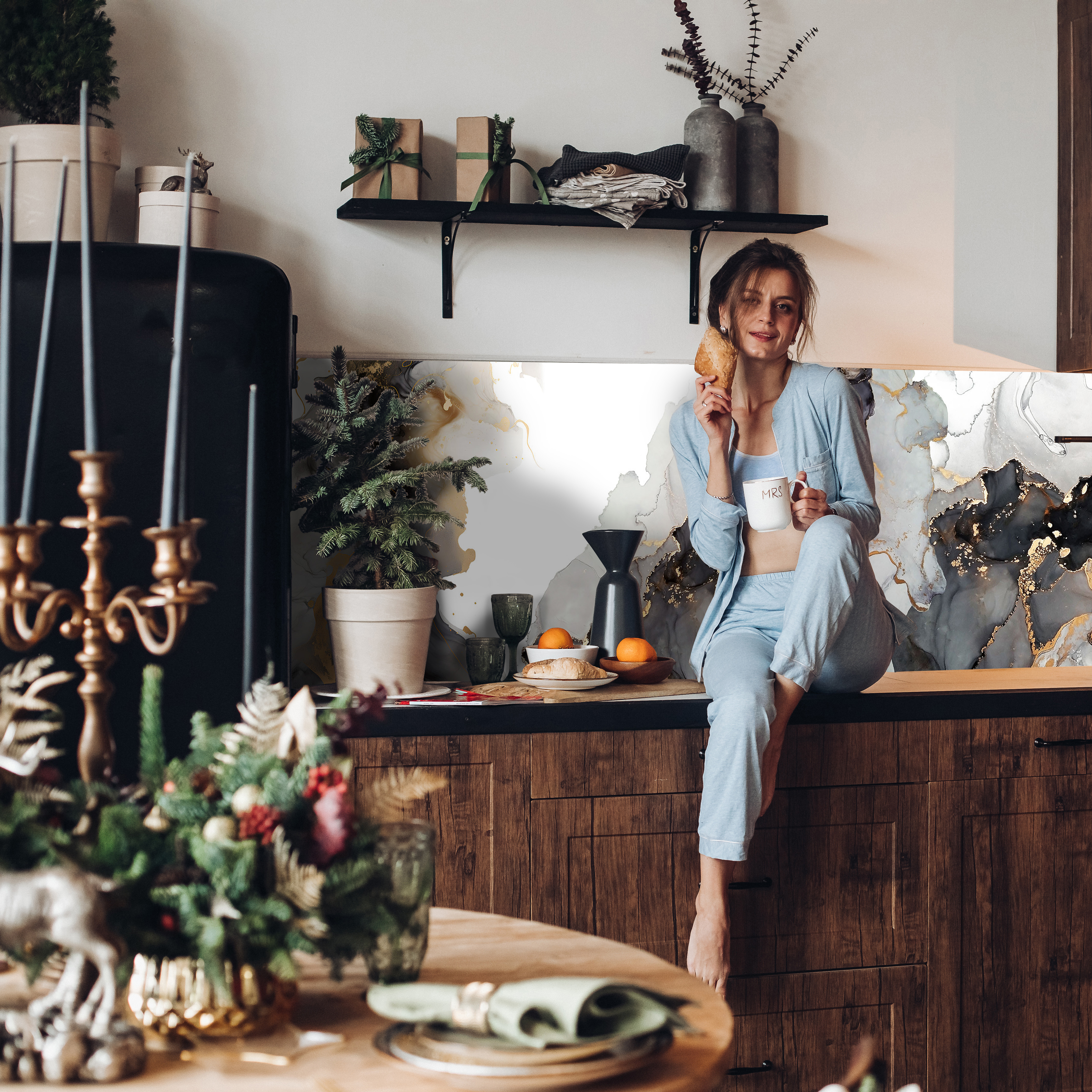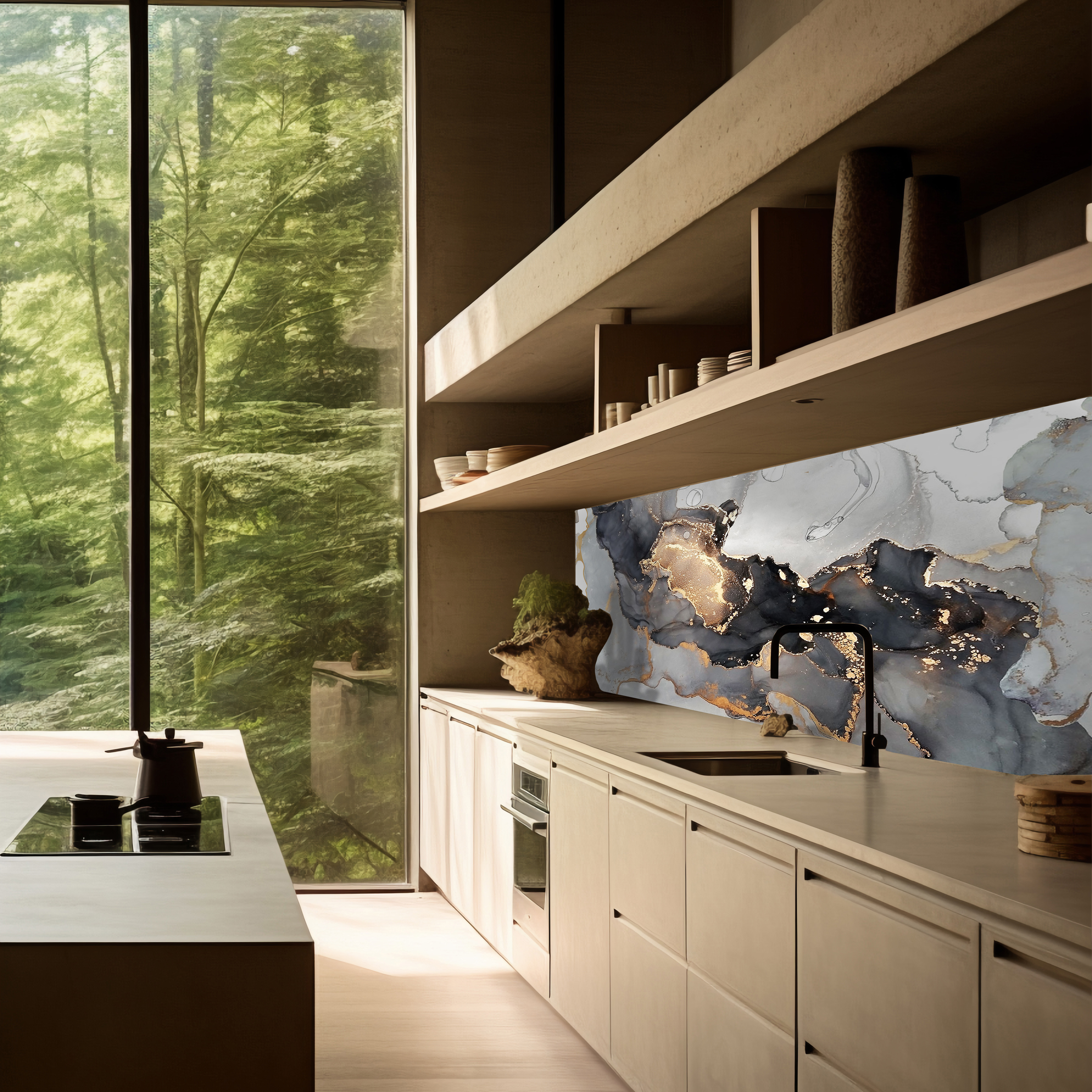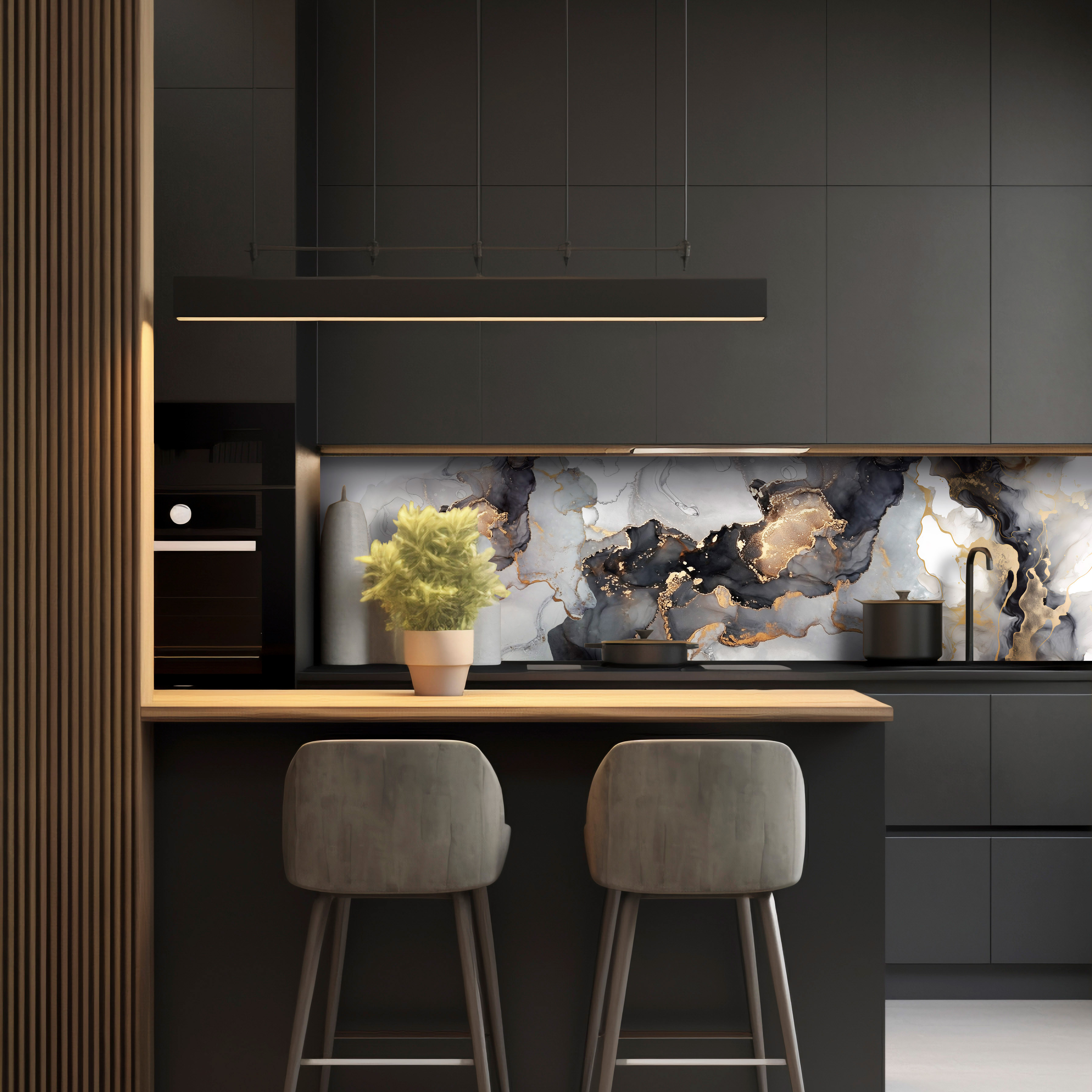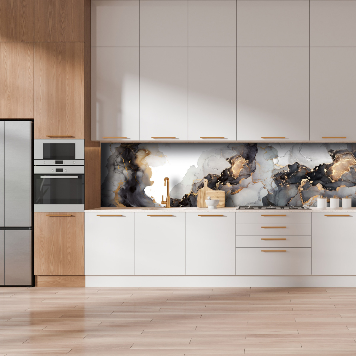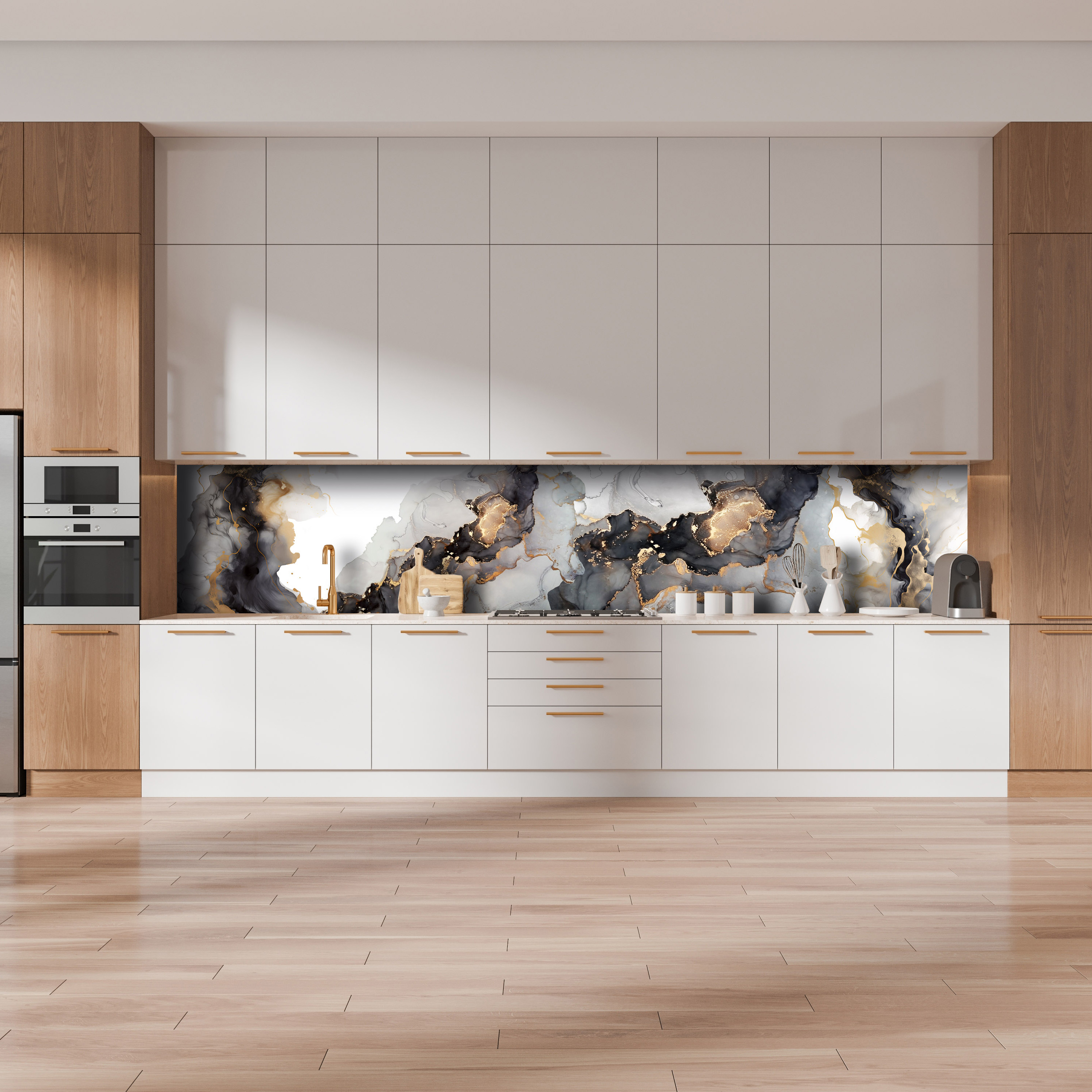 Кухонный фартук — элемент декора кухни, предназначенный для защиты стен от загрязнений. Преимущества: не боится влаги; высокая износостойкость; лёгкий; удобный при монтаже; устойчив к выцветанию и износу; удобен при транспортировке, складировании и хранении; Уход: Любое моющее неабразивное средство, например, то, которое используется для мойки посуды, или мыло. В большинстве случаев достаточно протирать поверхность влажной тканью.